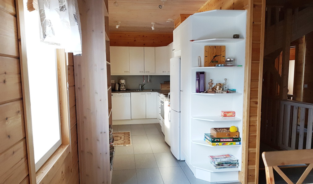 - Koneellistettu keittiö (astianpesukone, induktioliesi, kiertoilmauuni, liesituuletin, mikroaaltouuni, jääkaappi-pakastin + erillinen jääkaappi, kahvin- ja vedenkeitin, leivänpaahdin). Keittiöstä käynti pienelle yläterassille.
