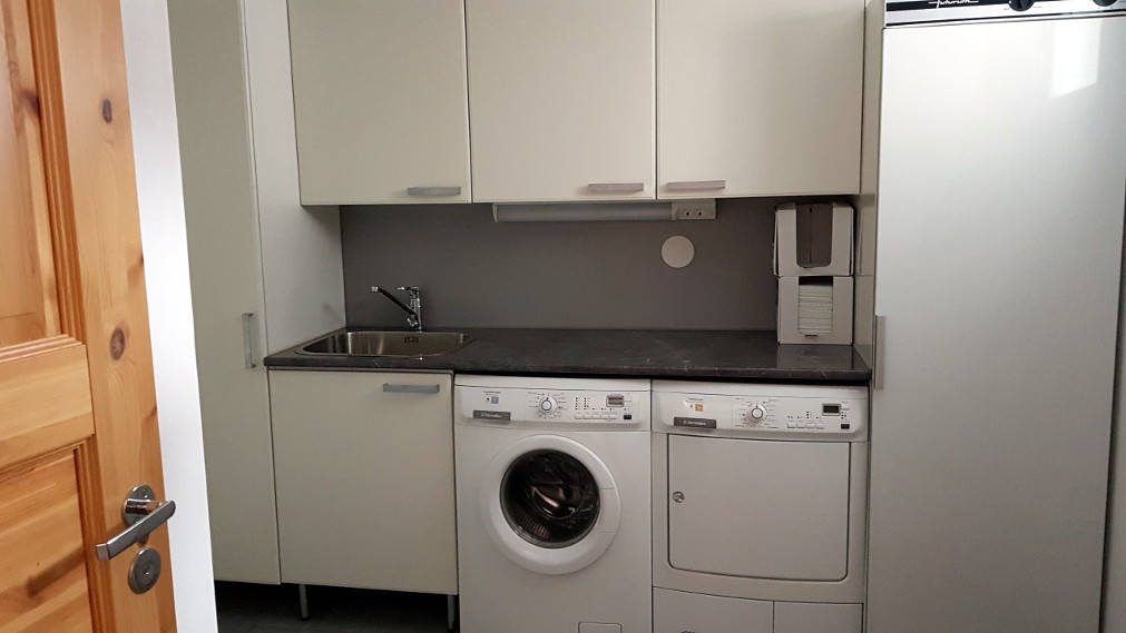- Kodinhoitohuoneessa pesukone, kuivausrumpu ja kuivauskaappi.